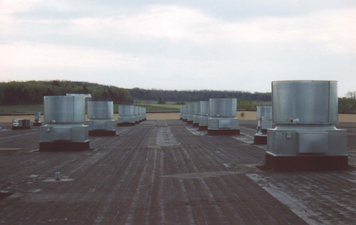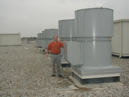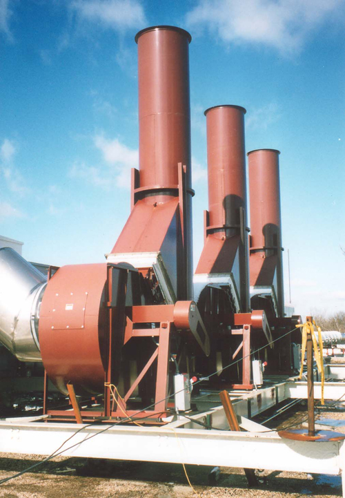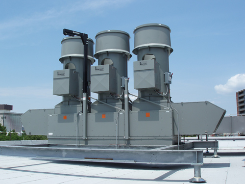 Greenheck model RBUMO-3L48 Up blast Exhaust Fans at a manufacturing facility in Central Kentucky. Each fan is exhausting 25000 cfm against .25" w.c