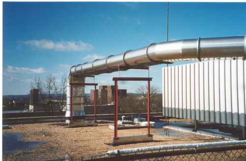Each of these Greenheck model 40-BISW-41 fans move 26,000cfm @ 4.0"w.c. of air. These fans and stacks have an air dried phenolic coating and are built in accordance with SMACNA's, Guide for Steel Stack Construction. These are located at a University science building in Central Kentucky.