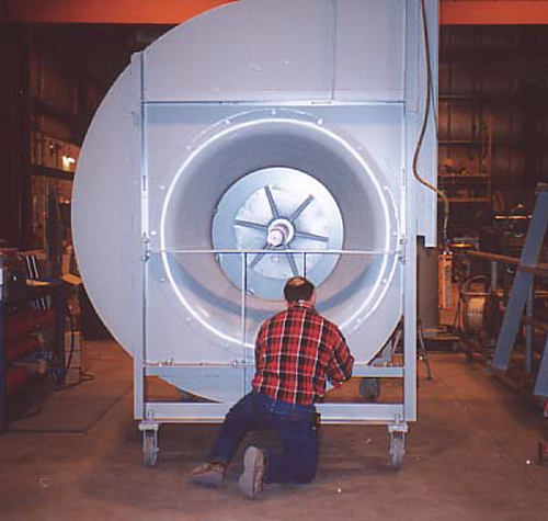 This Greenheck size 60, Series 41, double width, double inlet fan is capable of moving 150,000 cfm at 10" w.c. It is under construction at Greenheck's facility in Schofield, Wisconsin