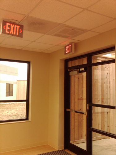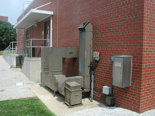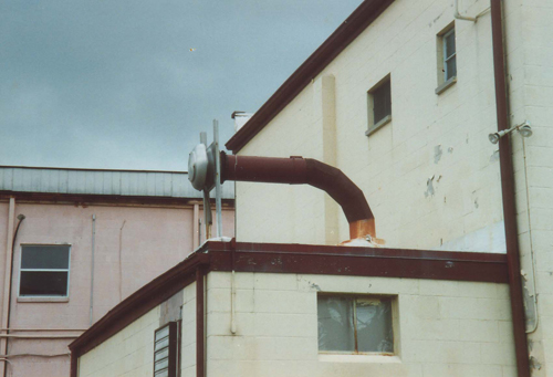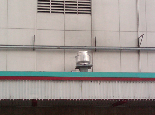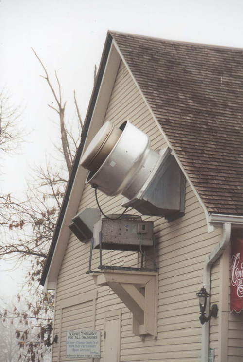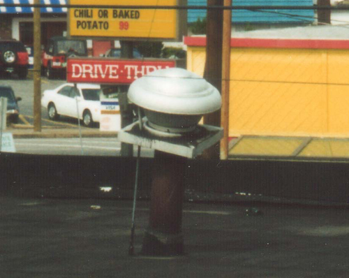 NFPA requires that grease laden air be discharged at least 40" above the roof surface..... not adjacent landscaping. Notice the grease laden air deflector shield.